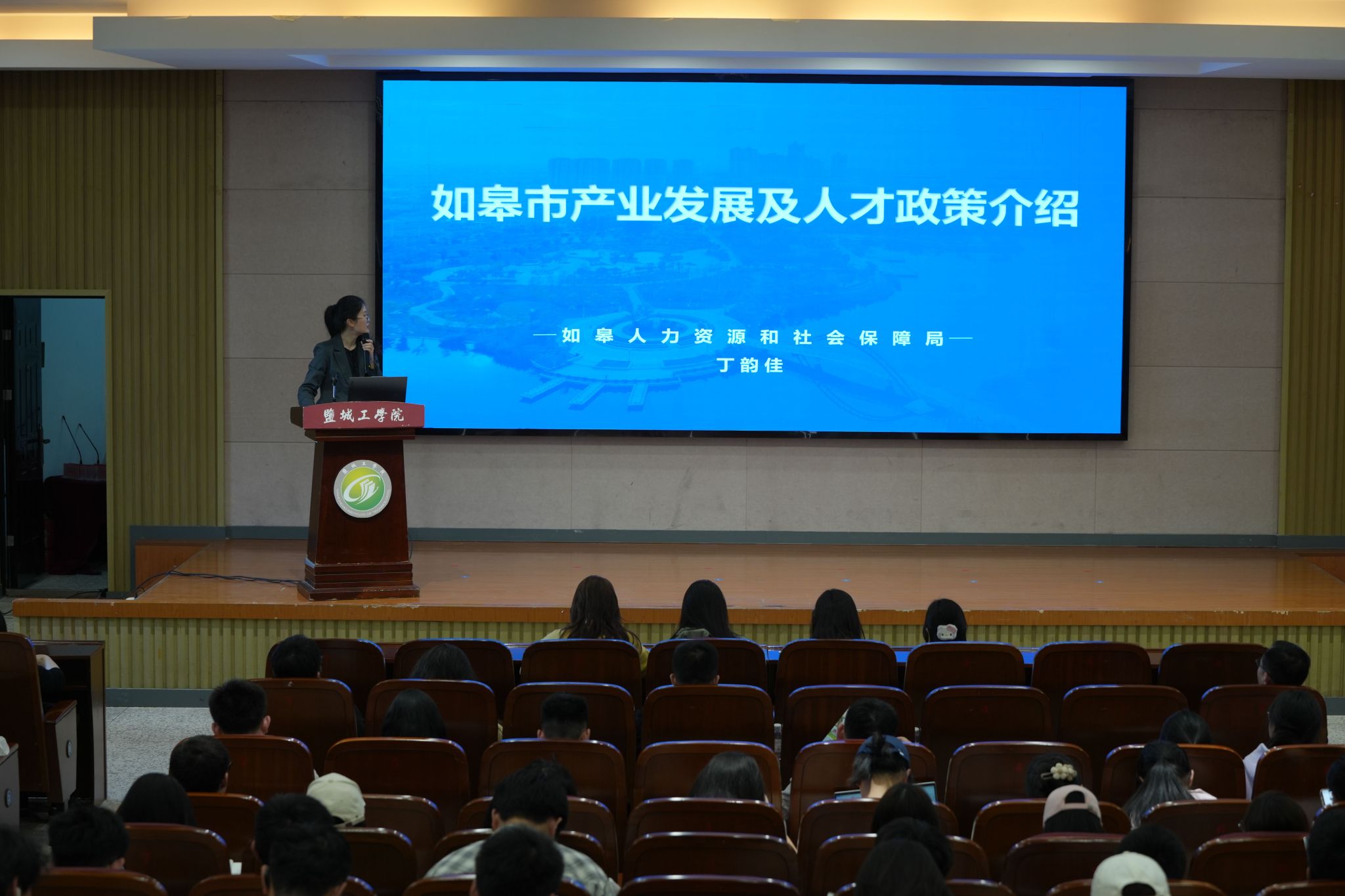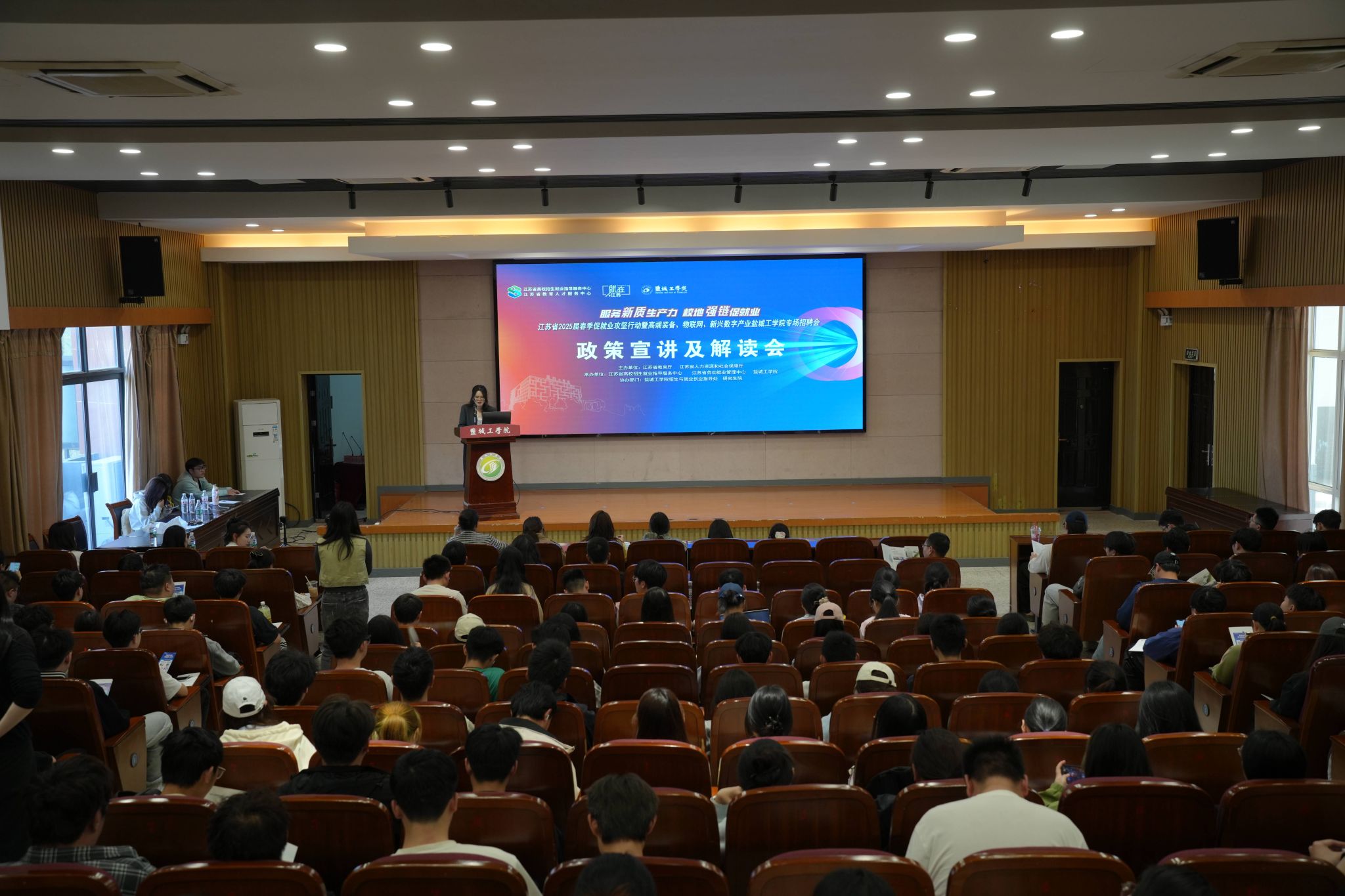 为助力毕业生高质量充分就业,学校就业创业指导中心在机械馆报告厅同时举办了就业政策宣讲及产业解读会,吸引300名学子参与。校团委解读国家和地方政府基层政策,如皋市人社局、亭湖区人社局、宝应县人才中心等负责同志,现场为同学们解读青年人才就业创业扶持政策,江苏索普(集团)有限公司、江苏金韦尔有限公司、恩梯梯数据(中国)信息技术有限公司等高端装备、物联网企业代表进行产业解读,并对2026届高校毕业生校园招聘进行推荐。
