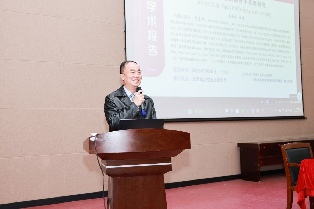 3月28日,苏州大学吴嘉炜教授应邀来校作题为“脂质转运蛋白的分子机制”的学术报告。校党委副书记、校长邵荣主持报告会,党委研究生工作部部长、研究生院院长、学科建设办公室主任许伟,海生学院院长彭斌、副院长齐志涛、张丽及研究生、本科生代表等100余人参加。